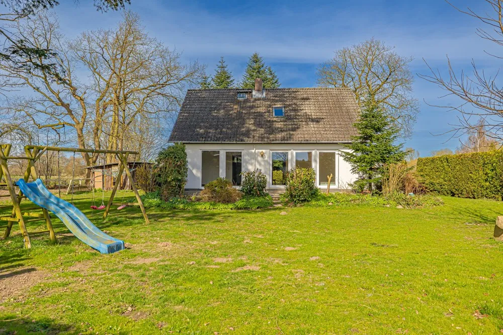 Doch nicht nur Ihre Vierbeiner finden hier ausreichend Platz vor, auch für die Zweibeiner ist genügend Wohnraum vorhanden. Neben dem Eigentümerhaus steht Ihnen noch ein weiteres Wohnhaus zur Verfügung und so bietet sich das Anwesen auch ideal für das Mehrgenerationswohnen an. Das Eigentümerhaus kann man als Doppelhaus-Resthof bezeichnen, wovon eine Hälfte Ihnen gehören wird. Die gut 200 m² Wohnfläche verteilen sich auf 2 Ebenen. Im großzügigen Garten mit seinem alten Baumbestand finden Sie auch eine gemütliche Gartenlaube und einen kleinen Teich vor. Hier kann man die Seele baumeln lassen und den Weitblick über das eigene Land genießen. Das Altenteilerhaus liegt etwas abseits und verfügt ebenfalls über einen wunderschönen Garten mit Blick auf die Koppeln. Hier hat man die Pferde immer im Blick. Das Haus hält etwa 128 m² Wohnfläche und einen Vollkeller mit separatem Eingang für Sie bereit. Viel Platz für Mensch und Tier...